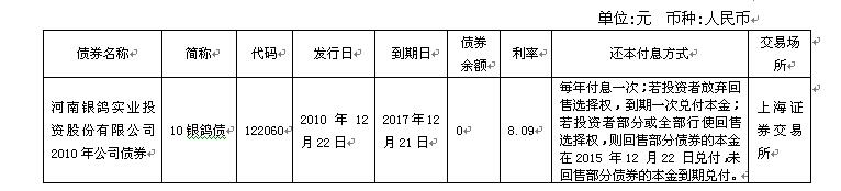2017年12月12日,公司發布《河南銀鴿實業投資股份有限公司“10銀鴿債”公司債券本息兌付和摘牌公告》,并于2017年12月22日按期支付了2017年的公司債券利息款和剩余債券本金,“10銀鴿債”完成兌付并摘牌。(公告編號:臨2017-108)